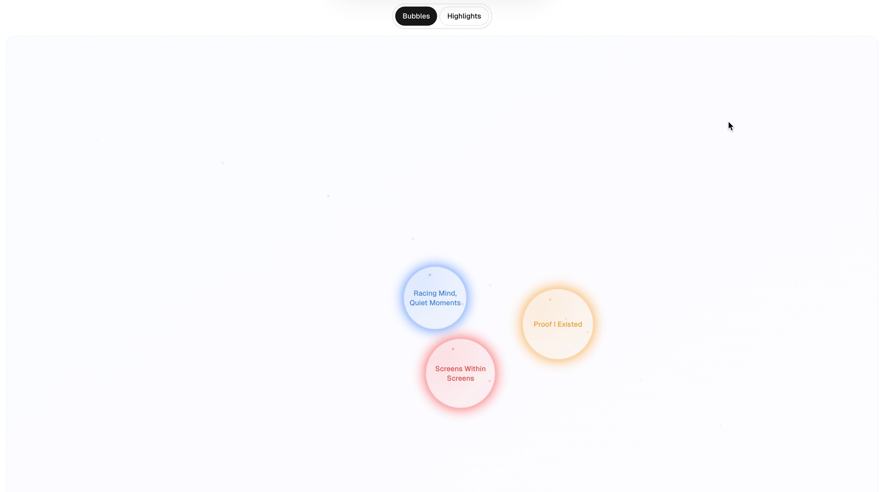 My first idea to display ‘themes’ when done writing was a spacial bubble layout. While fun to play with/animate, it wasn’t efficient at displaying what parts of the text related to the grouped themes. It also did not work well on mobile.