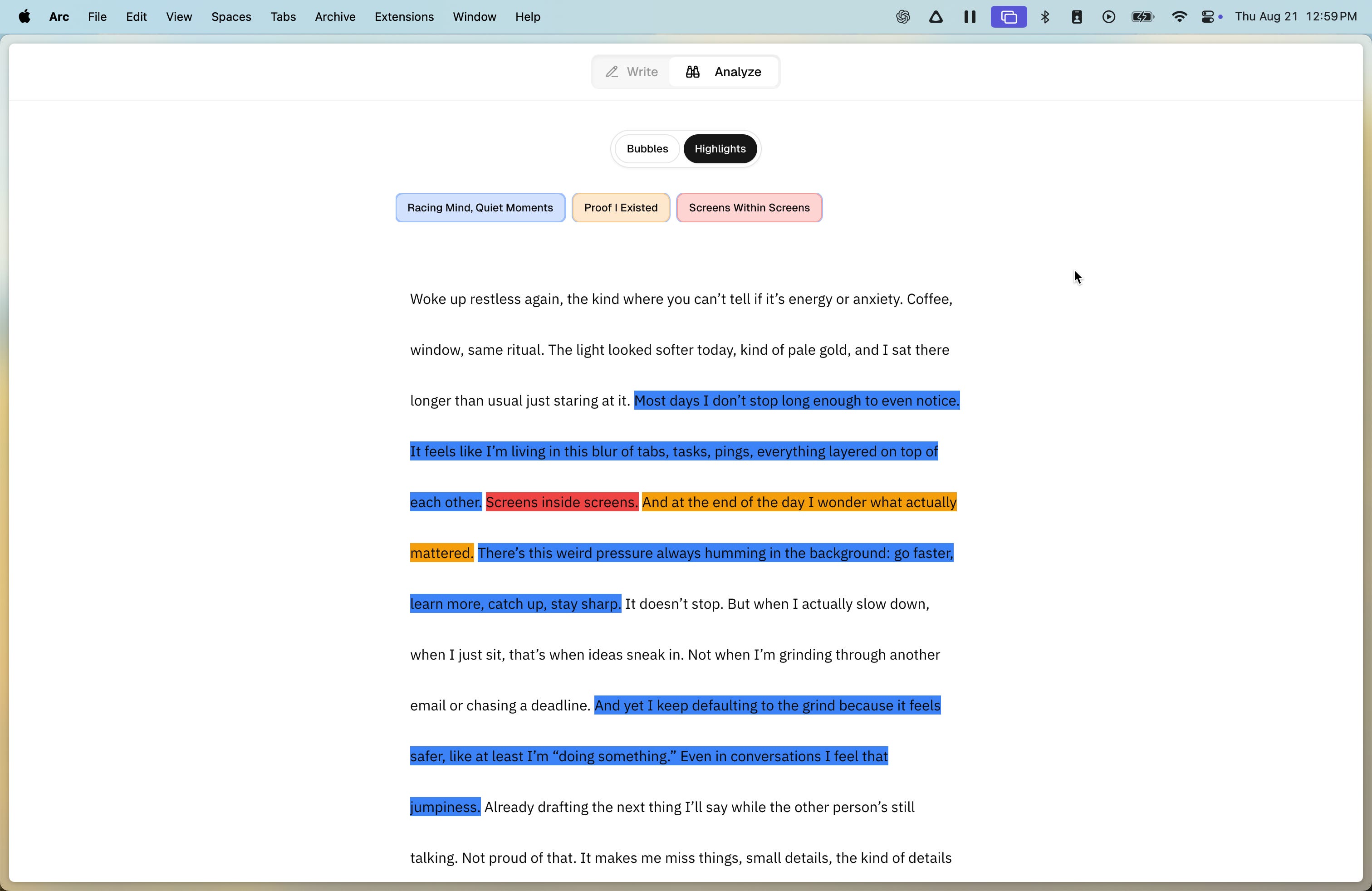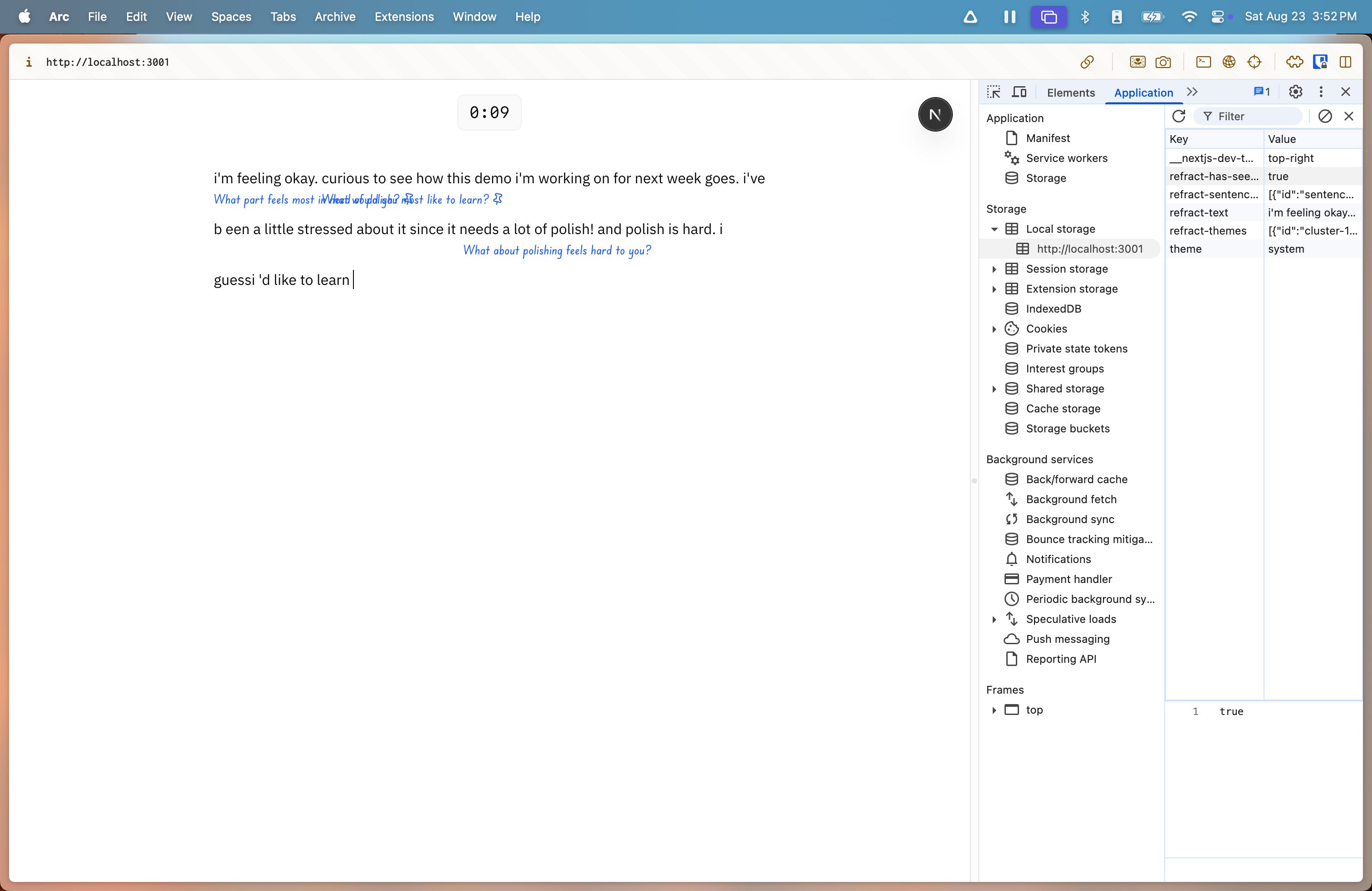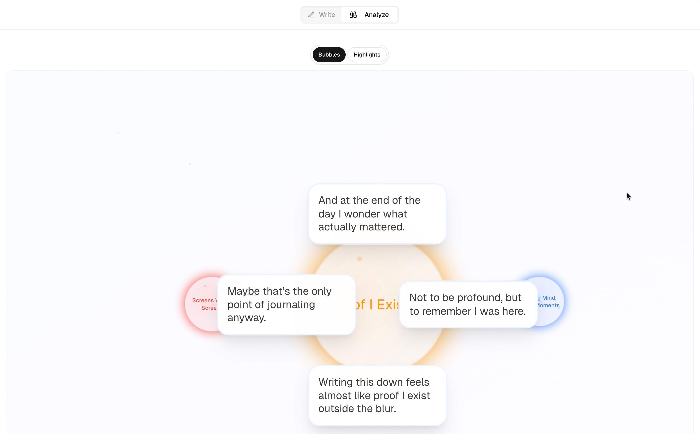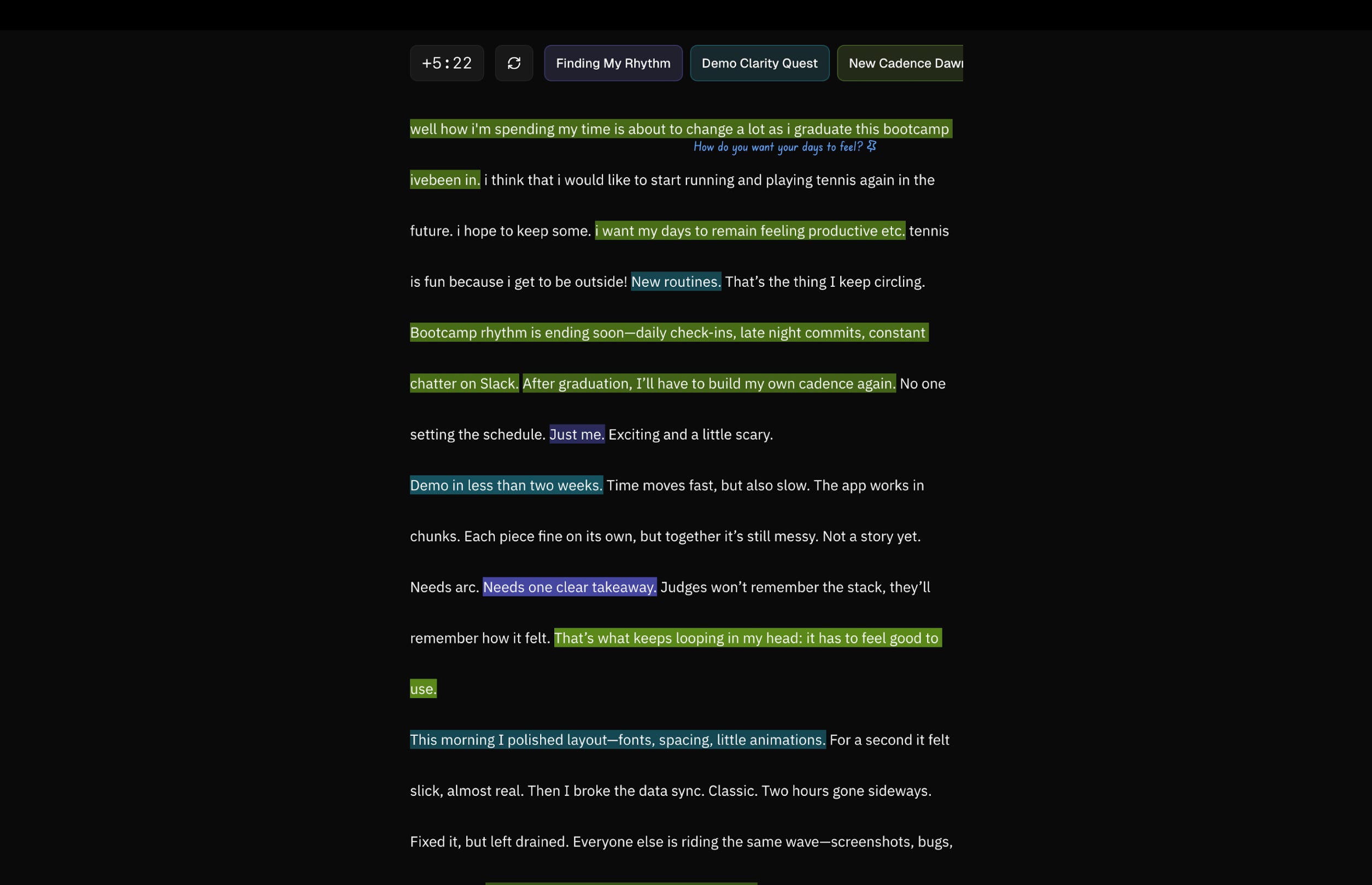 The hardest part wasn’t getting the AI to generate thoughtful nudges or recognize themes, it was positioning elements in the browser. Text areas weren’t designed for this, so I had to trick the DOM into letting me layer intelligence on top of plain text