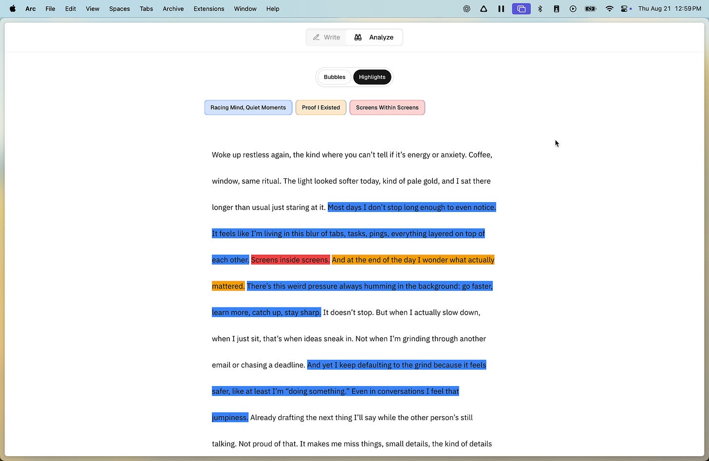 Since I started journalling recently - I thought it would be a good place to explore new interaction patterns. I wanted to stay in the flow of writing, but get suggestions on how I could go deeper on the fly. When done, I wanted to better reflect on what I wrote.