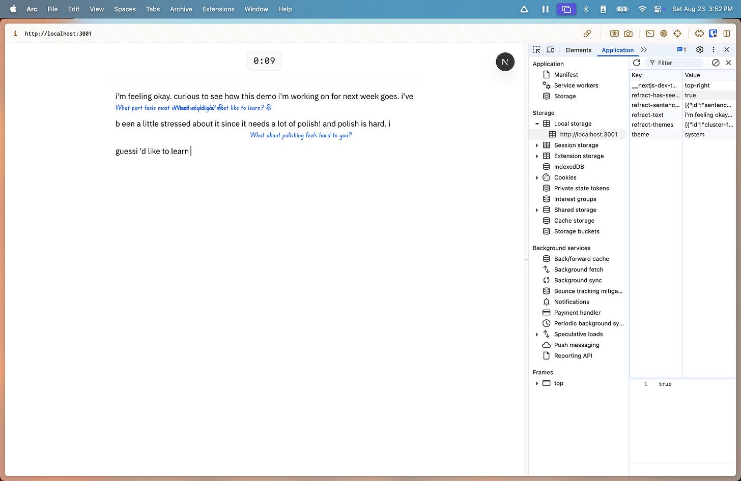 Everyone that has written on Refract has written for longer than their intended goal, often not realizing that they’ve gone long beyond their initial goal! People are generally satisfied and sometimes impressed with the quality of the nudges, and like seeing how their themes changed as they wrote. while balancing latency and quality continues to be a challenge, i’m excited about new ways to bring LLMs - and AI in general - into a more collaborative relationship with people. In undergrad, I read about a concept called ‘soft tech’ where architects were proposing a future for technology in the context of the home, embedded into the architecture itself. Refract is a small attempt at ‘soft AI’: not something that demands attention and surveillance, but something that lives quietly in the background that amplifies human agency and thought. I remain curious and optimistic about a future where AI is built in the context of human creativity, connection, and reflection. Try it yourself at refract.site.
